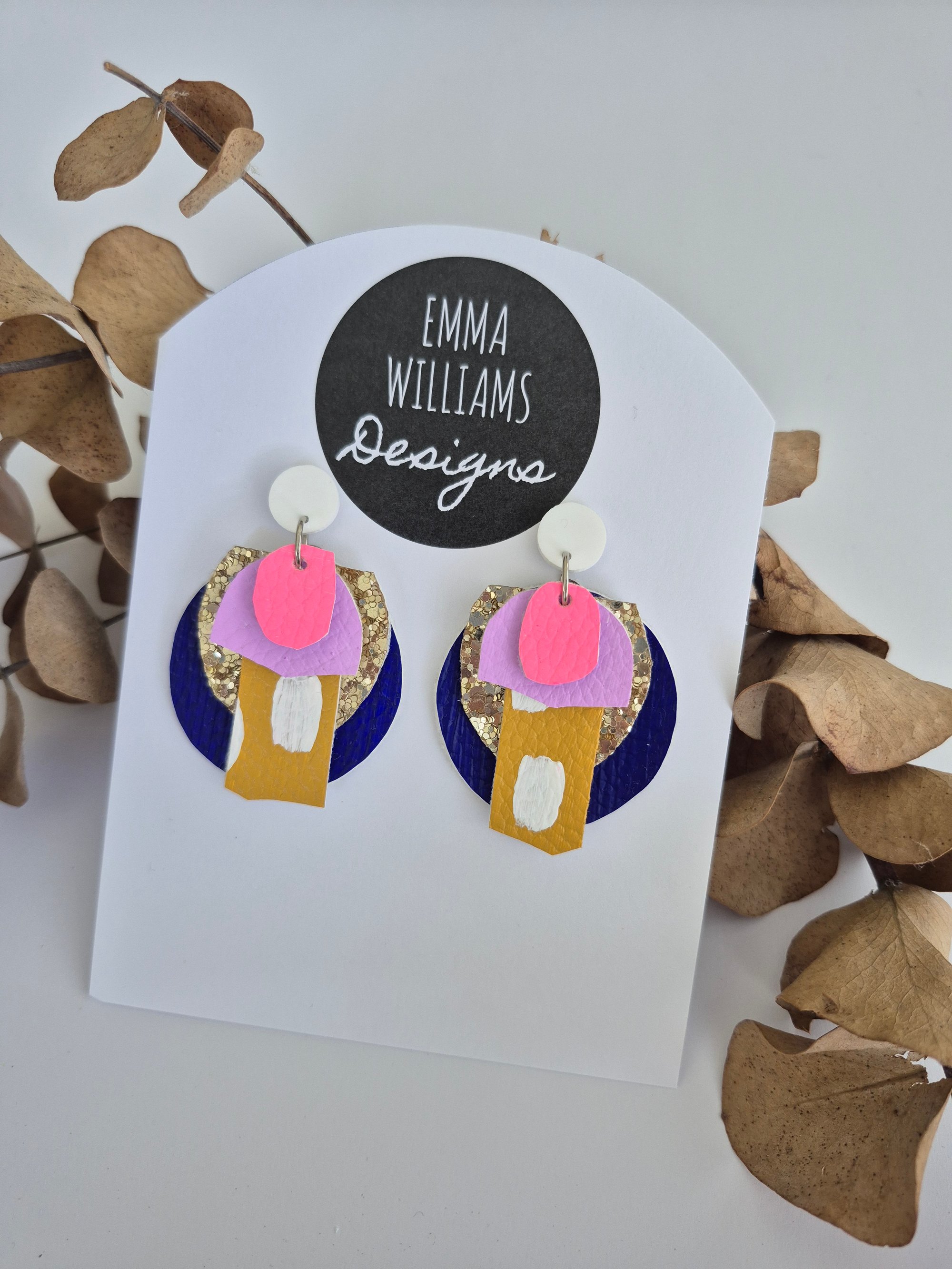 One of a kind original earrings. Handmade by Emma Williams. Layered design of painted leatherette. Super lightweight & kind to your lobes. Surgical steel posts/ backings, Perfect for sensitive ears.