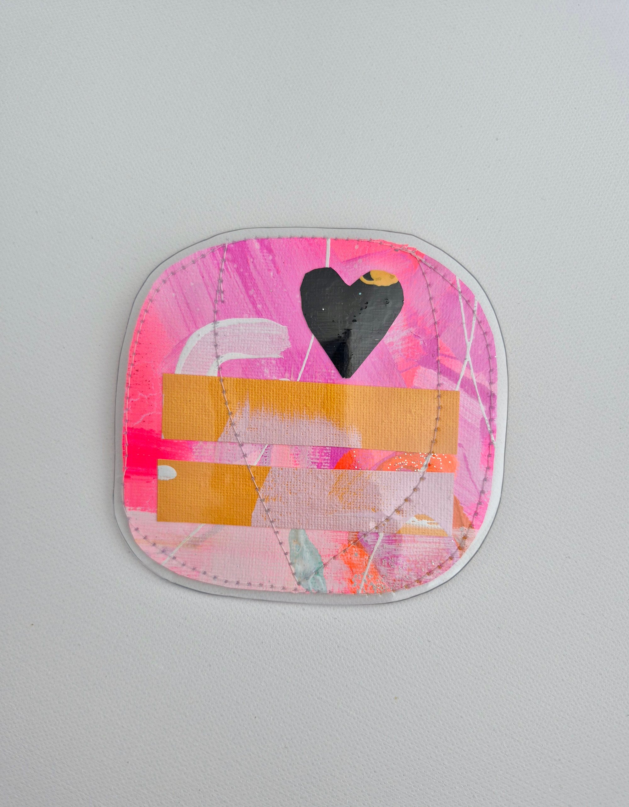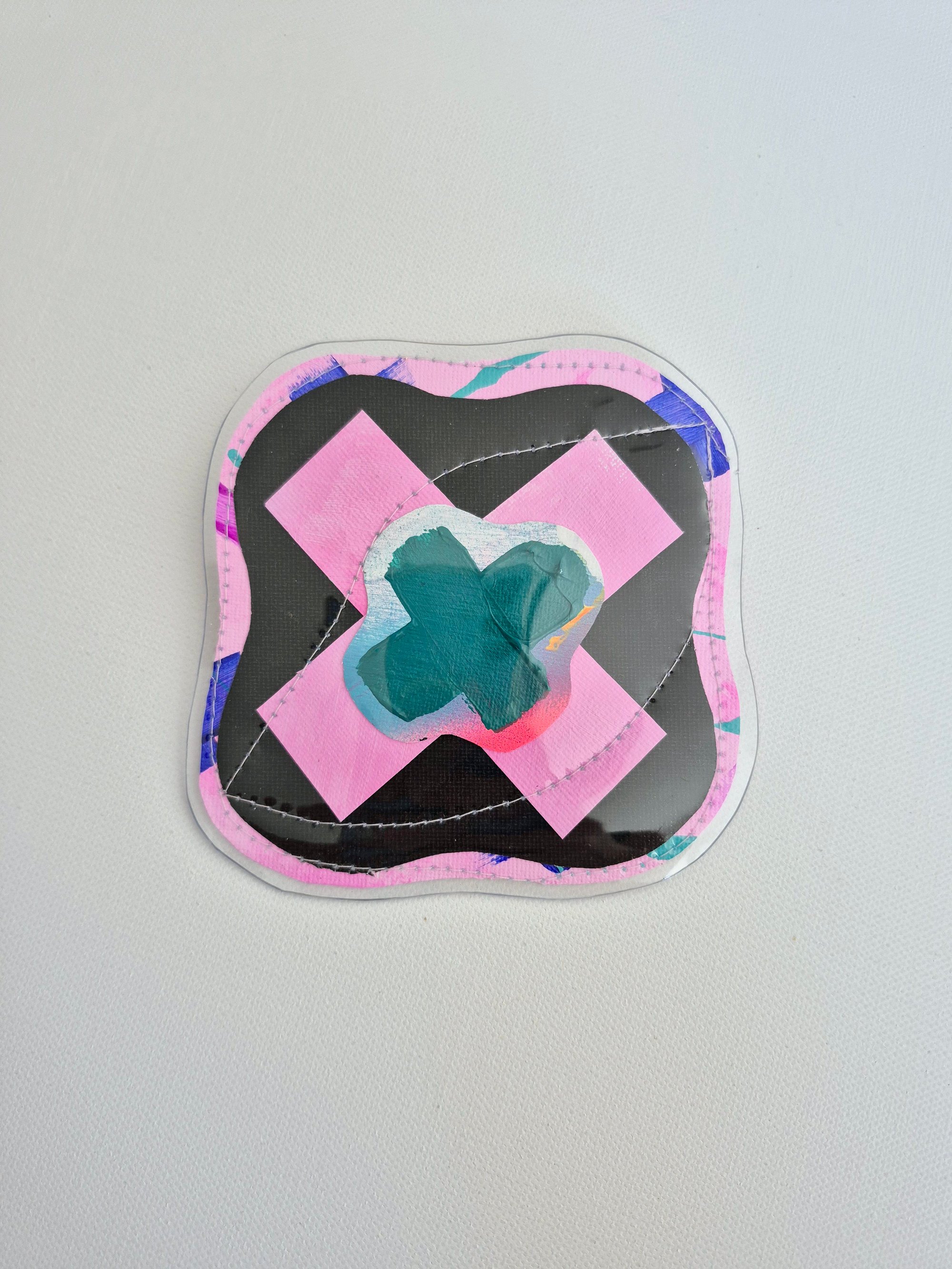Made from handpainted canvas & layered between a soft clear vynil cover & sewn.