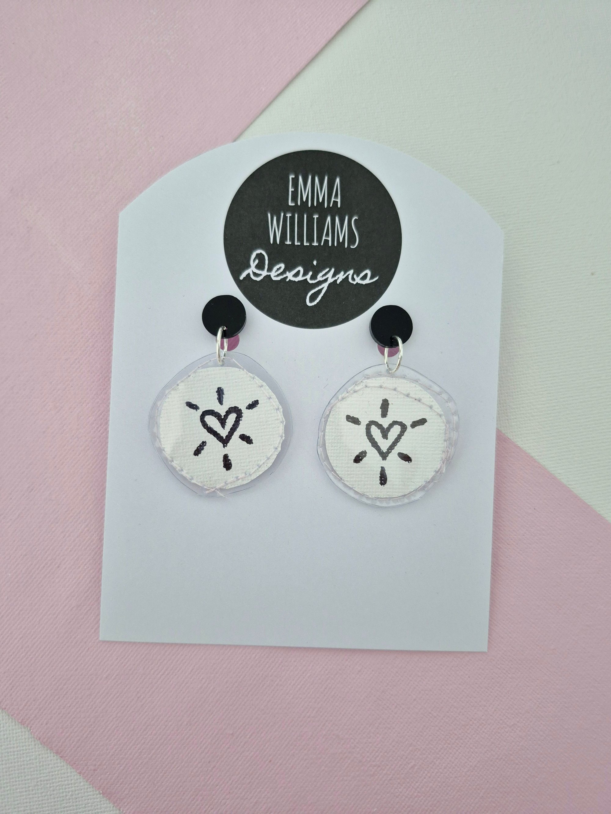 Handpainted canvas, sewn in-between protective soft clear vynil. Finished with a stud top + surgical steele earring post/ backing.