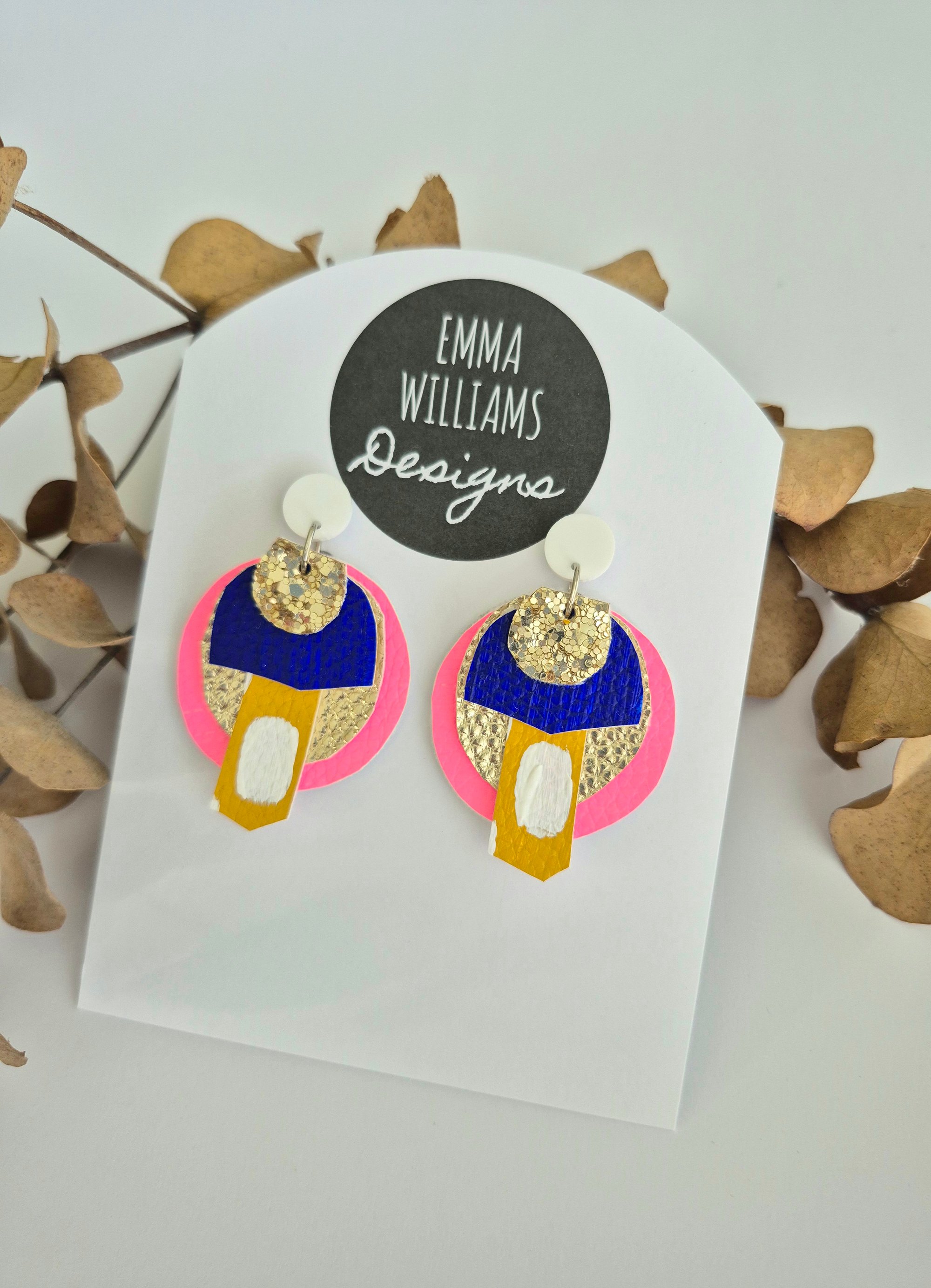 One of a kind original earrings. Handmade by Emma Williams. Layered design of painted leatherette. Super lightweight & kind to your lobes. Surgical steel posts/ backings, Perfect for sensitive ears.