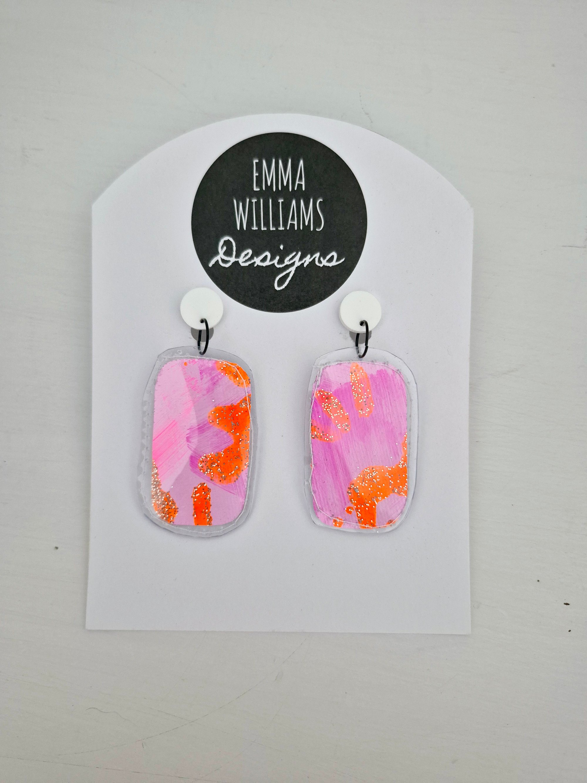 Handpainted canvas, sewn in-between protective soft clear vynil. Finished with a stud top + surgical steele earring post/ backing.